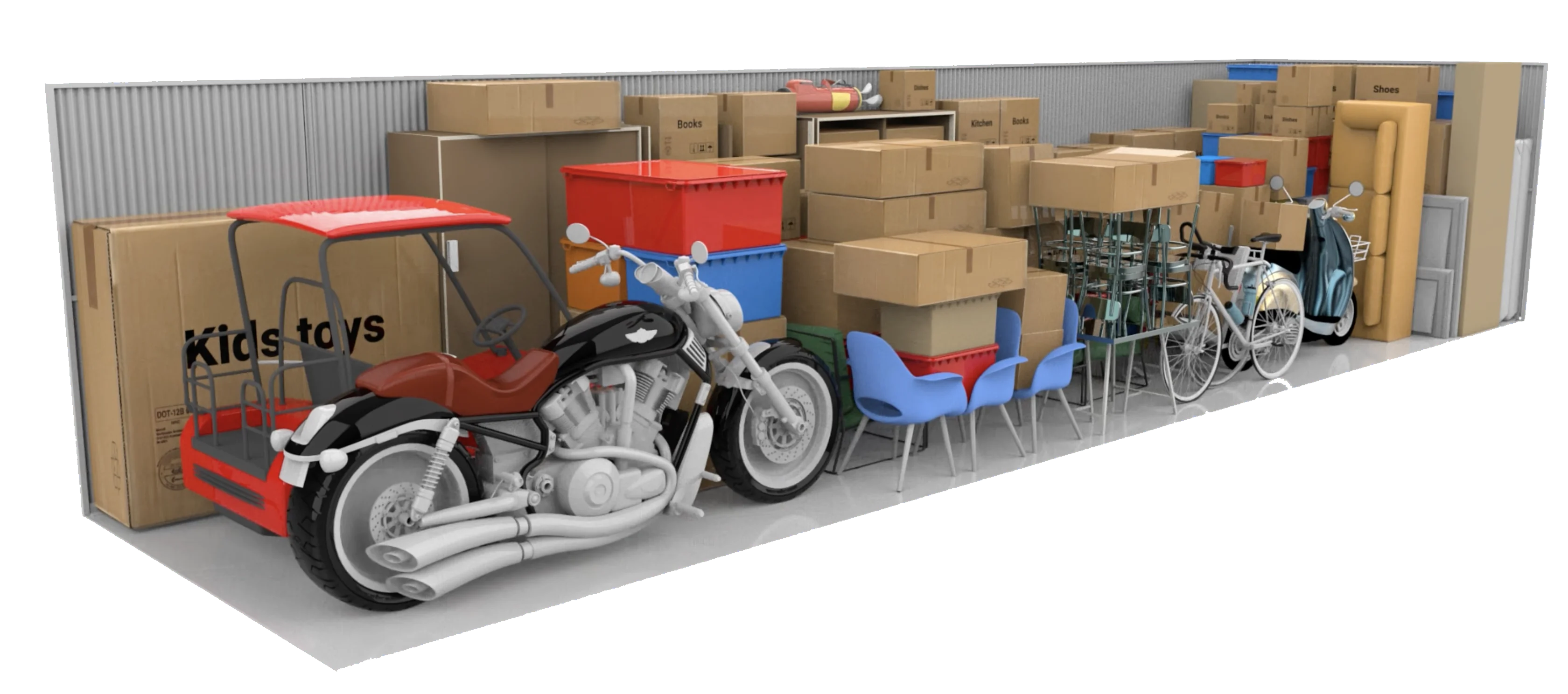 | Golf Cart | 5’x10’ to 10’x10’ | Include accessories like clubs, bags, or batteries |